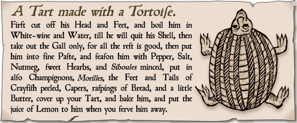 One of the collection boldly titled ‘A Perfect School of Instructions for the Officers of the Mouth‘, was published in 1682 and includes this bizarre recipe for a tart containing the entire body of a tortoise. Perfect for those late summer dinner parties you were all planning. Now, where did I put my tortoise net…