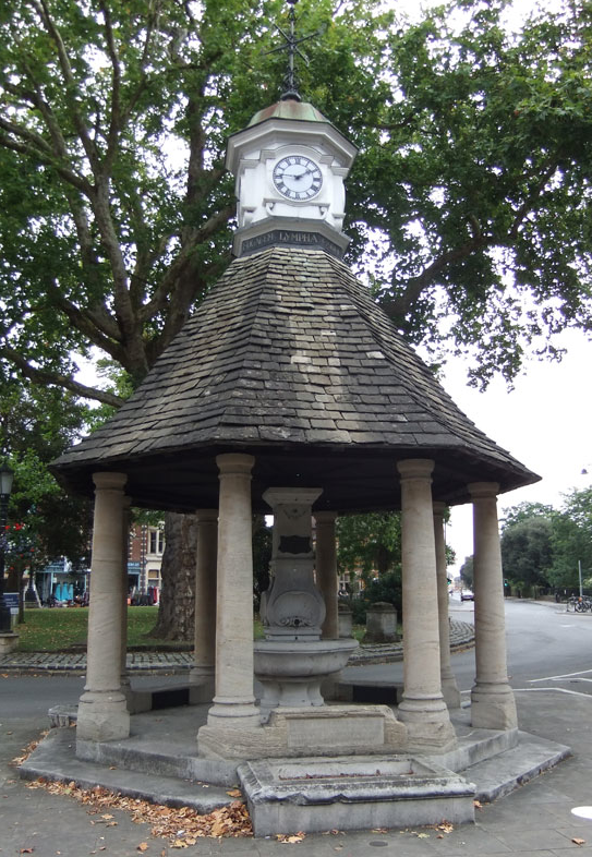 The octagonal building, designed by P.E. Warren in 1899, is supported on eight Tuscan columns, has a central fountain with a scallop motif and four cocks, and a conical tiled roof with clock and weather vane… all very quaint, but a little out of place in the middle of a busy roundabout.